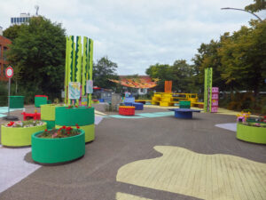Dank des Engagements vieler Interessierter konnte auf einer Teilfläche (betrifft nur rund 30 der etwa 220 Stellplätze) die Installation von mobilen Obstkisten-Möbeln, Spielgeräten und vom auffälligen und anlockenden Bodengemälde realisiert werden.